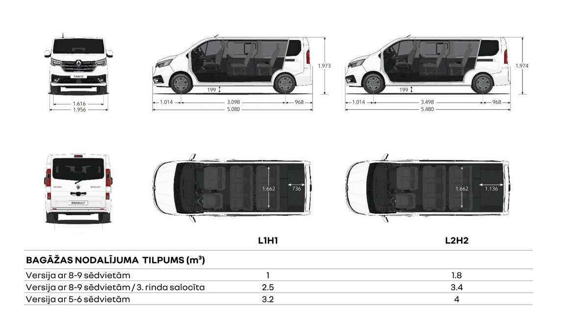 Trafic Combi var uzņemt līdz 9 cilvēkiem un viņu bagāžu, vai, ja nepieciešams, jūs varat demontēt 2. un 3. sēdekļu rindu, palielināt kravas telpas apjomu, nezaudējot komfortu!